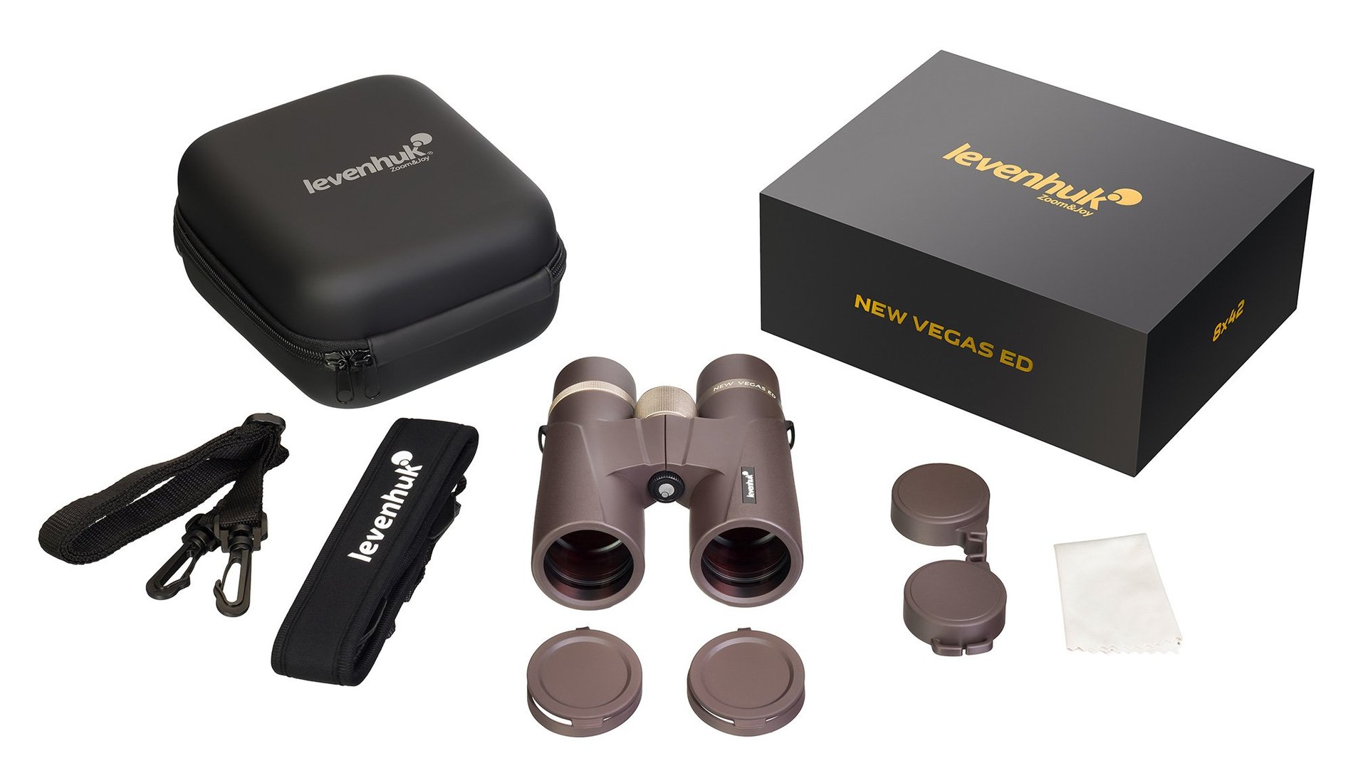 Binokulární dalekohled Levenhuk New Vegas ED 8x42 má výkonný optický systém s 8x zvětšením, který využívá střechové hranoly pro kompaktní konstrukci a jasný obraz, který je živý a realistický za všech provozních podmínek. Toho je dosaženo speciální konstrukcí okuláru, který se skládá z pěti optických členů ve třech skupinách. Čočky a hranoly mají vícenásobnou antireflexní vrstvu. To zajišťuje efektivní a pohodlné sledování očí při slabém osvětlení, například za soumraku. Objektiv je vyroben ze skla s velmi nízkým rozptylem, který je bez chromatické aberace a poskytuje jasný a čistý obraz. Hranoly jsou vyrobeny z optického skla BaK-4, které je známé svou vysokou propustností světla.
